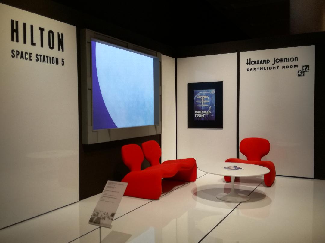 A recreation of the space lounge in 2001: A Space Odyssey, complete with product placement